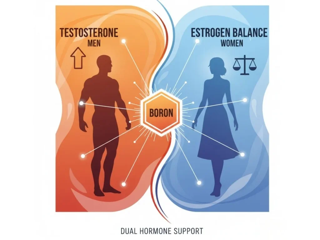 Boron has a unique role in optimizing hormonal health. Studies show it increases free testosterone levels in men while also improving estrogen metabolism in women.