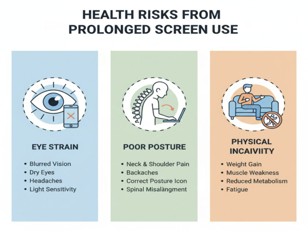 Screen time reduces opportunities for movement, contributing to obesity, cardiovascular risks, and metabolic dysfunction.
