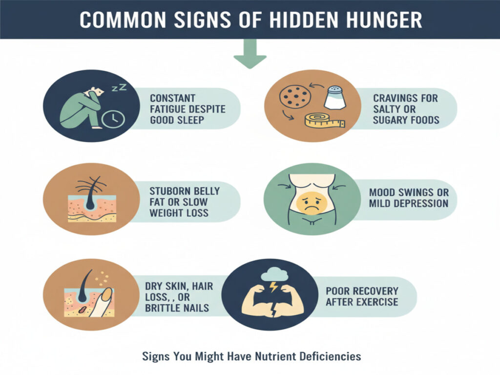 While hunger pangs tell you when you need calories, hidden hunger manifests as fatigue, brain fog, mood swings, and weight stagnation — subtle signs your body is starving for nutrients, not food volume.