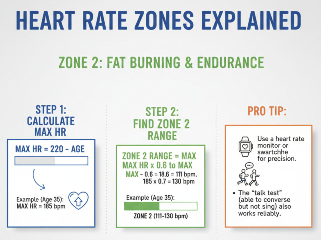 Zone 2 typically equals 60–70% of your MHR, the sweet spot where the body efficiently uses fat as its primary energy source.