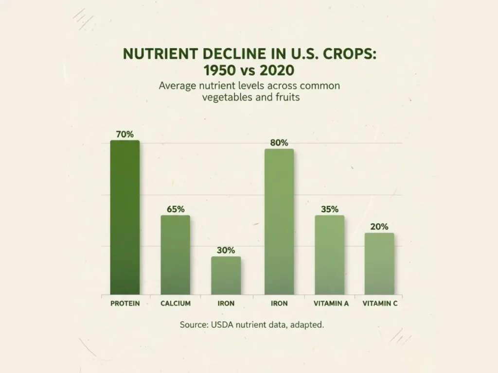 Studies from the U.S. Department of Agriculture (USDA) reveal a striking trend: between 1950 and 2020, the nutrient density of vegetables declined by 15% to 40% in key vitamins and minerals.
