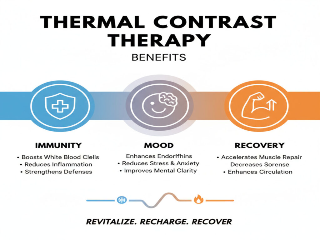 - Hormonal Response: Thermal contrast stimulates endorphins, norepinephrine, and cortisol regulation, improving mood and stress tolerance.
