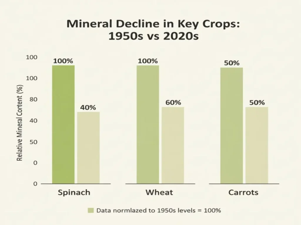 Statistic: The U.S. Department of Agriculture (USDA) reports that since 1940, magnesium content in vegetables has fallen by 19–25%, and iron levels in grains by up to 30%.