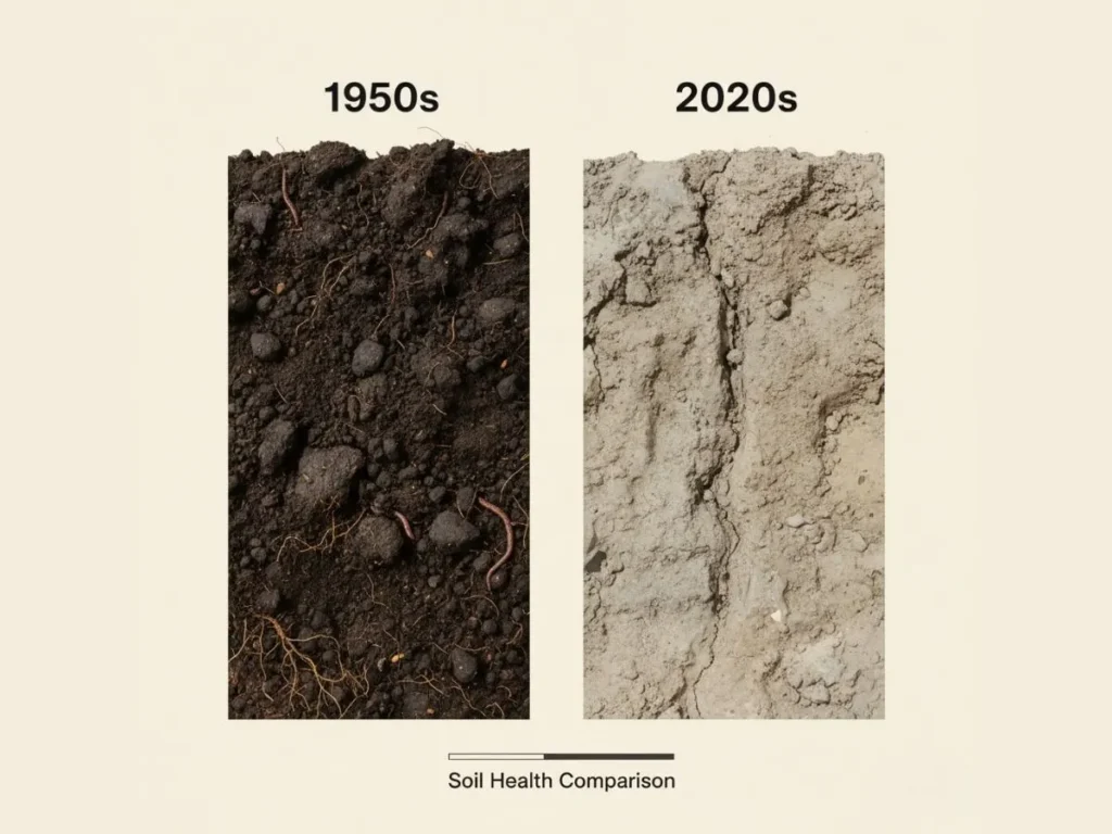 Suggested image placement: Side-by-side graphic of rich dark soil (1950s) vs pale depleted modern soil (2020s).